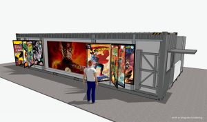 - LED Megascreen: On the back side of the Pop-Up Shop, facing the Capitol Building, an enormous 15-by-9-foot LED screen will be running living art (motion graphics) of iconic comics and high-impact, super-powered video clips and trailers featuring DC Super Heroes from comics and television.